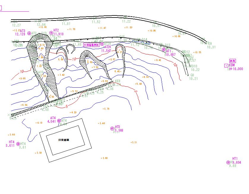 これに点群より判別しにくい側溝端や道路端、ガードレール等はトータルステーションで抑え込み、これを合成し250分の1の現況平面図も作成しています。